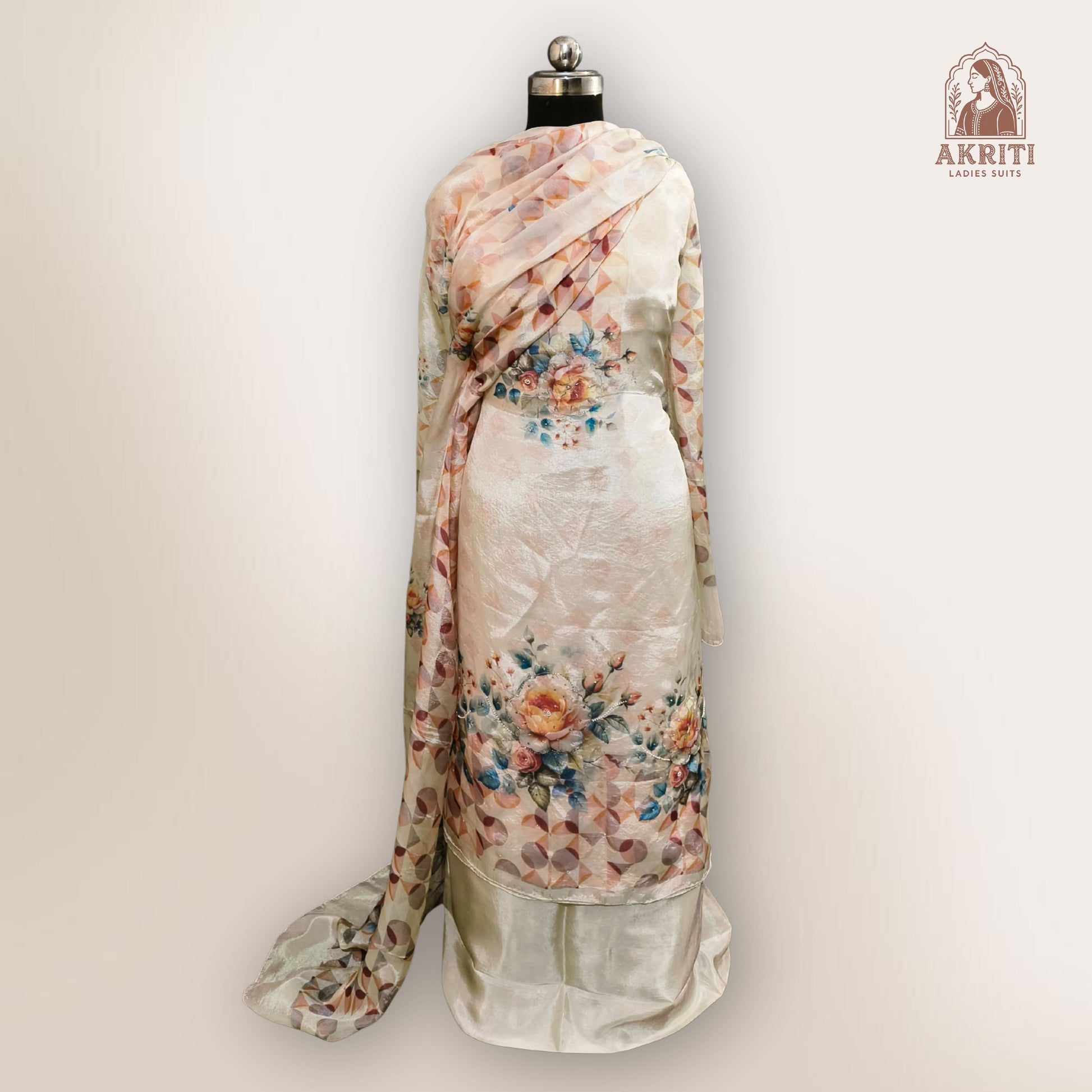 Digital printed ladies suits with highlighting of shimmery handwork, fabric of kurti and dupatta is viscose glass and opara slawaar.