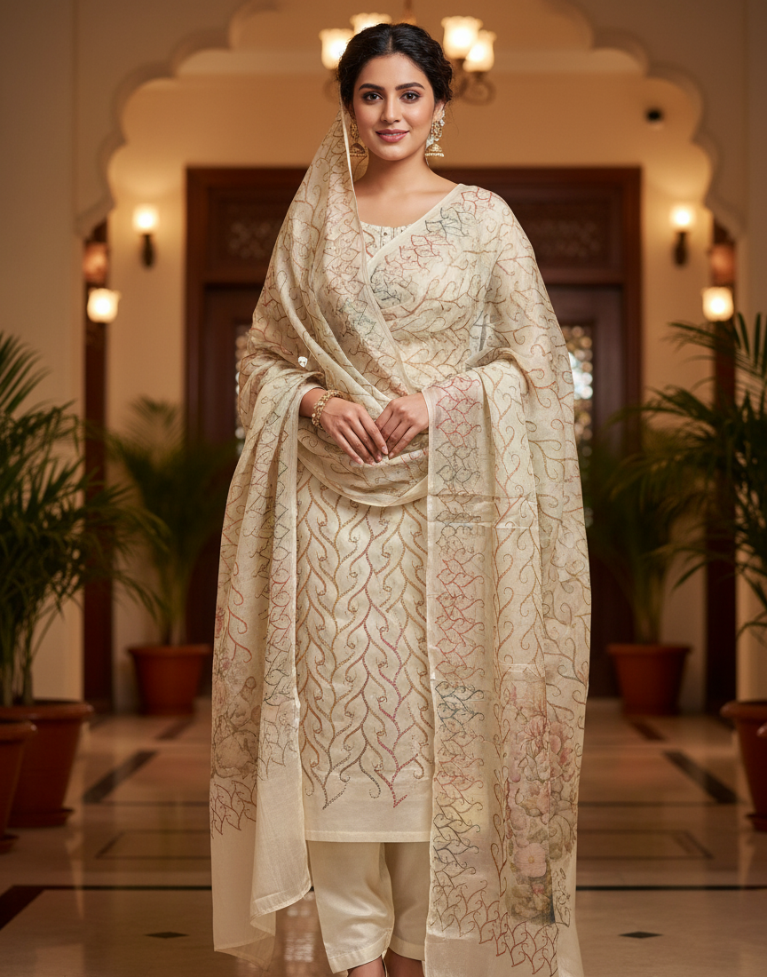 Wheat shimmer Burberry fabric with hand embroidery highlights. Paired with a soft crape bottom.